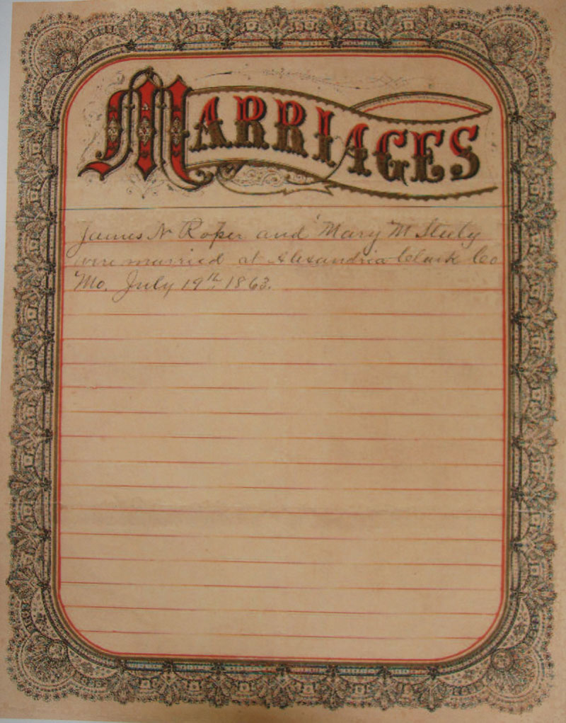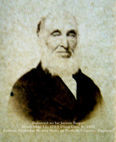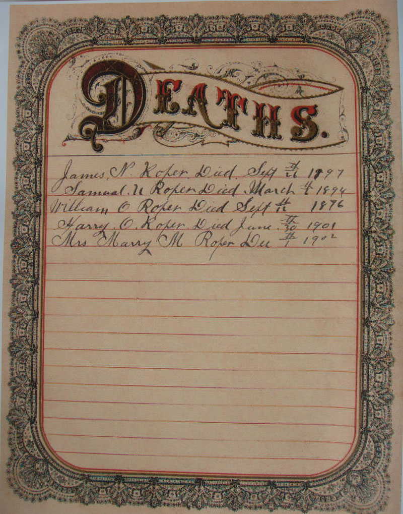 Roper, James Nicholas - Son of William Thornton and Sarah W. Cowen Roper. The bible was presented to James Nicholas Roper as a wedding gift. The bible contains Marriages, Births and Death records taken in different handwritings. It contains two photos, one of which is identified as Samuel W. Roper, the first born son of James N. and Mary Steely Roper. The photo of the lady in unidentified, it could be the wife or the mother of James Nicholas Roper.