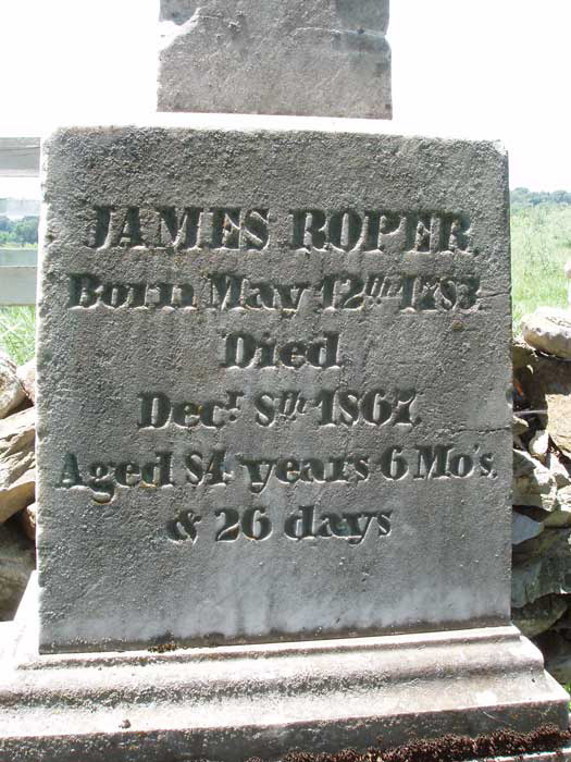 Others that are most likely buried here: William Thornton Roper 1814 - 1849; Nicholas Osburn Roper September 17, 1811 - November 19, 1872; There are two Field stones set on each side of James Roper; they could be for his 2 eldest sons. It's unknown if either of James Roper's wives are buried here or where Mary Horn Roper, wife of Nicholas Roper, is buried. Nicholas and James are the only two early graves that are marked with manufactured stones.