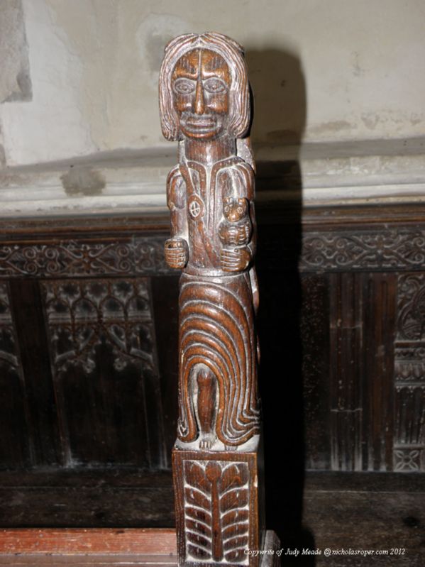 Interior: one of two witch carvings; she is holding an owl and has pulled up her skirt.